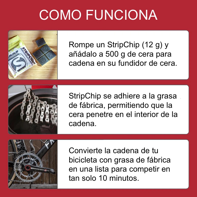 Presentación práctica: StripChip se vende en formato de barra de chocolate, con seis componentes (12 gramos cada uno). Usar un componente por cadena elimina eficazmente la grasa de fábrica, permitiendo que la cera termofusible penetre en el interior de los pasadores y rodillos de la cadena.