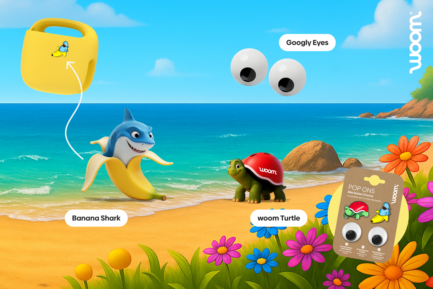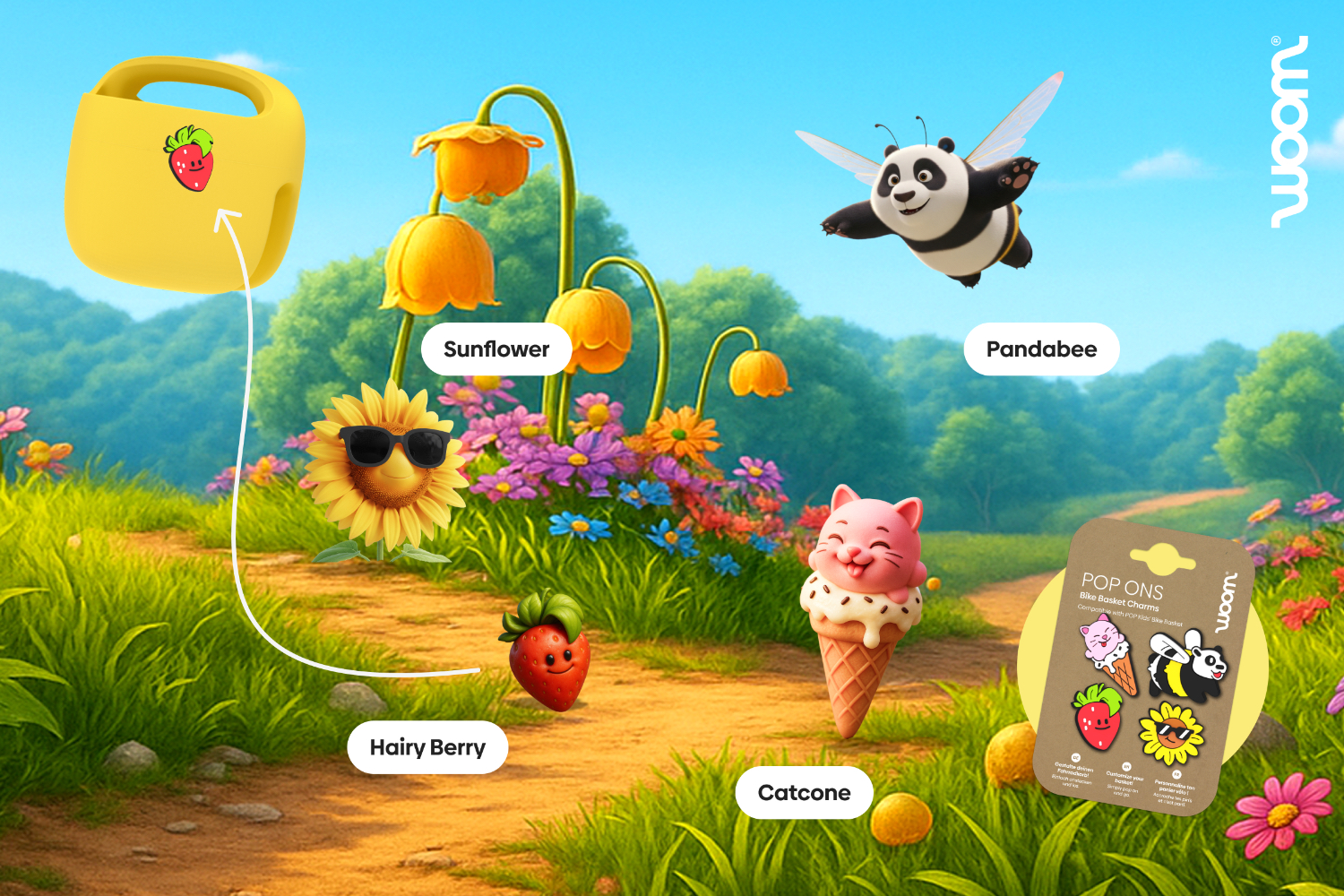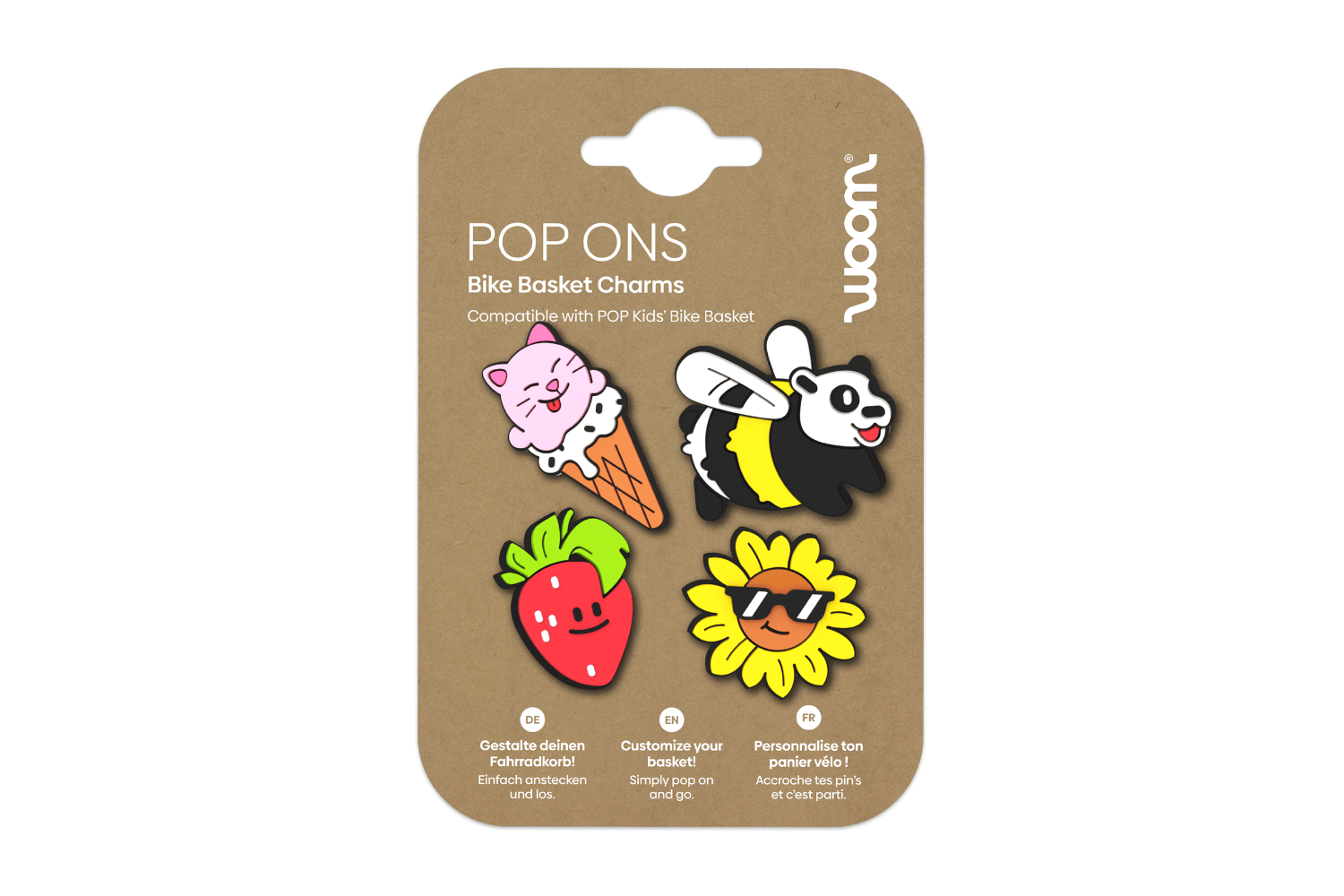 Set de 4 Charms para que tu hijo/a personalice su canasto de bicicleta Woom POP para divertirse aún más mientras pedalea.